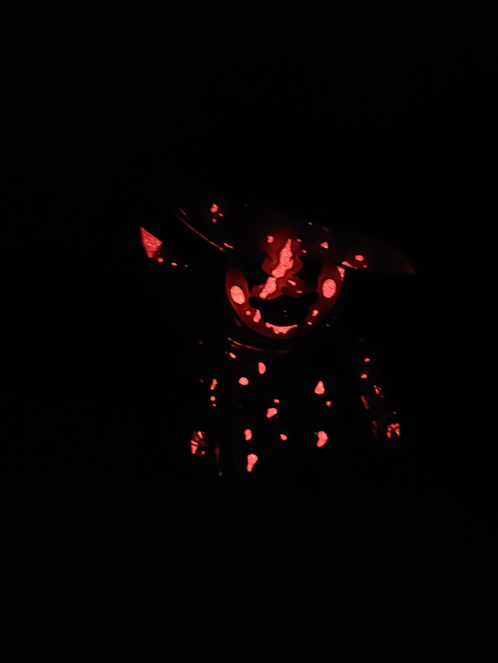 The "Glow" variant has red glow on its cheeks and blood area, the best reaction to keep glow and seen in the picture was with the help of a blacklight.